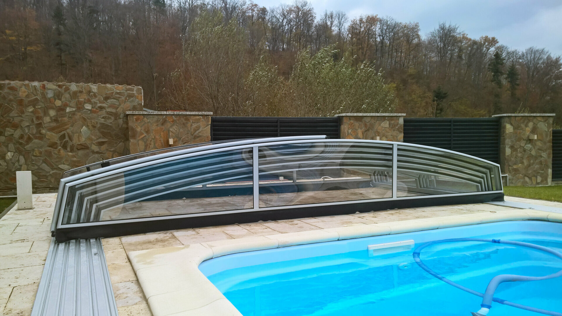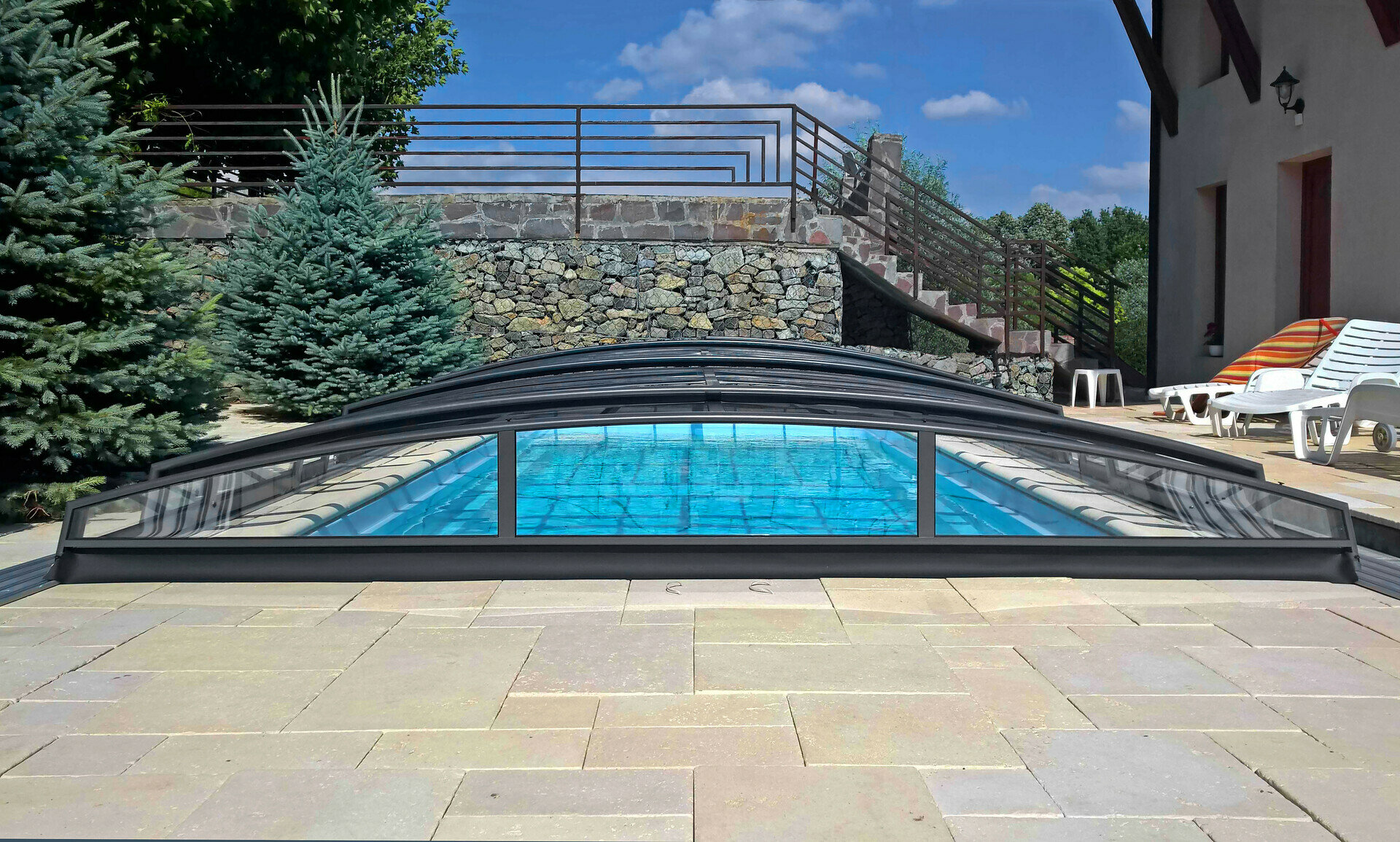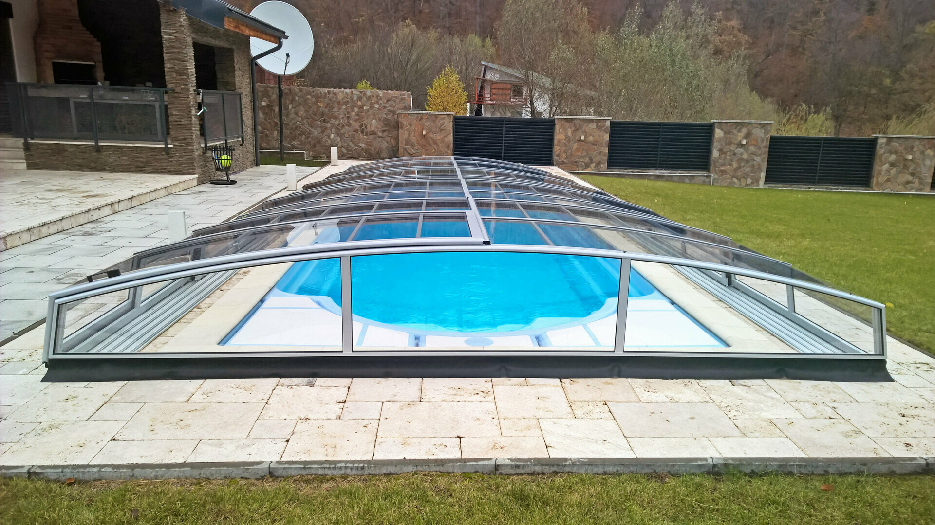 Najnižšie zastrešenie bazéna z radu AZURE kombinuje oblú strechu a šikmé steny. Vďaka tomu získava zastrešenie veľmi ladný a zároveň moderný tvar, ktorý sa hodí do každej záhrady.