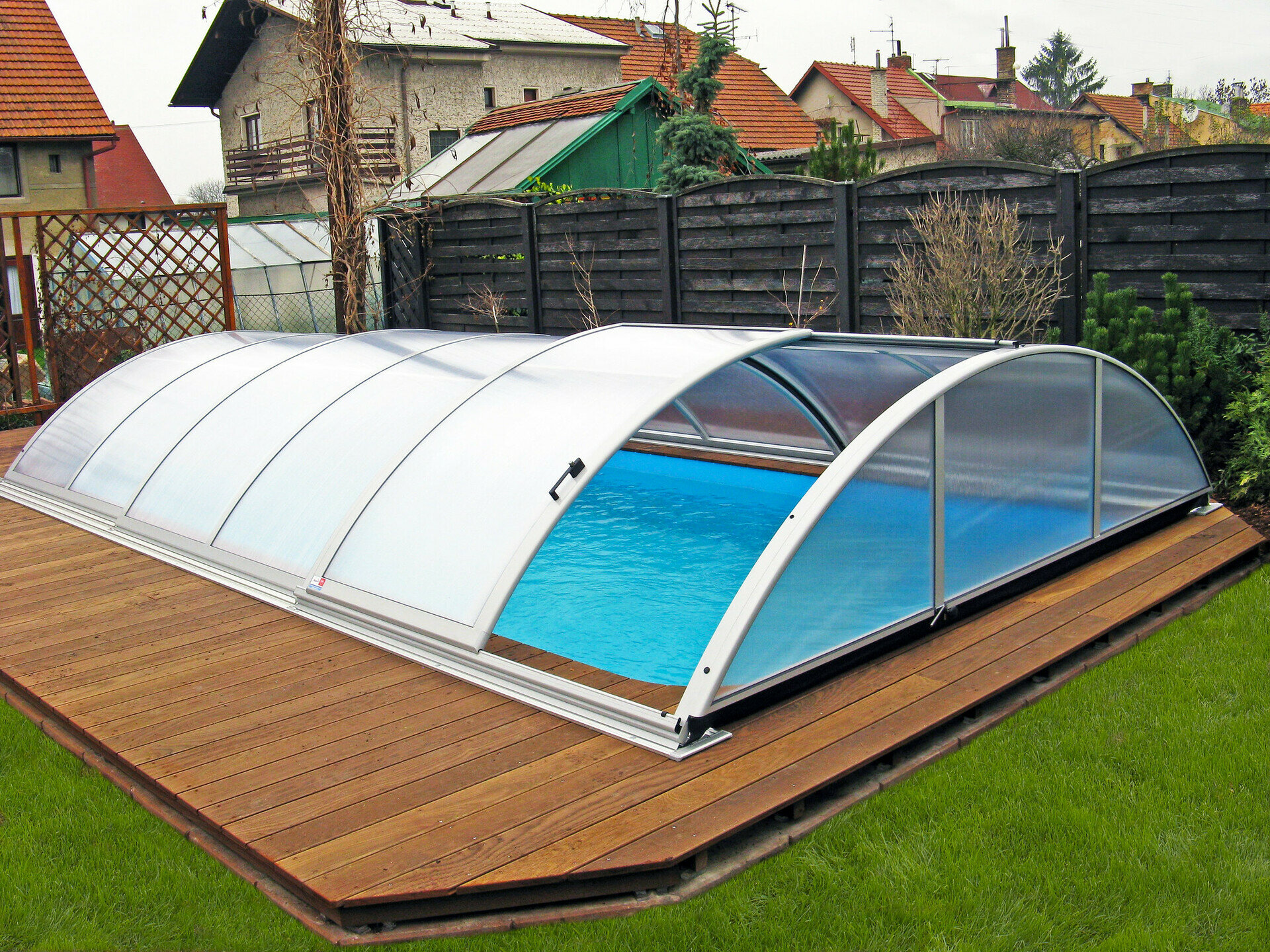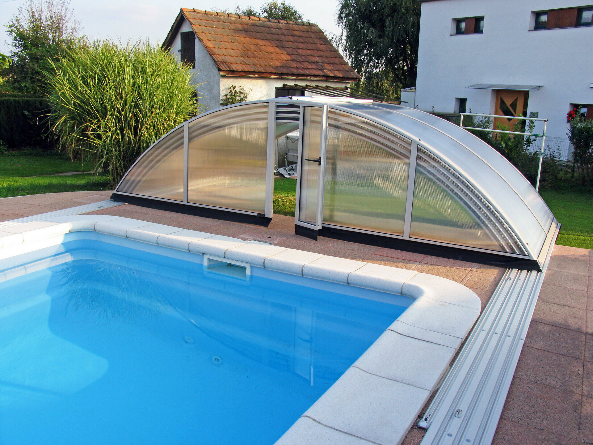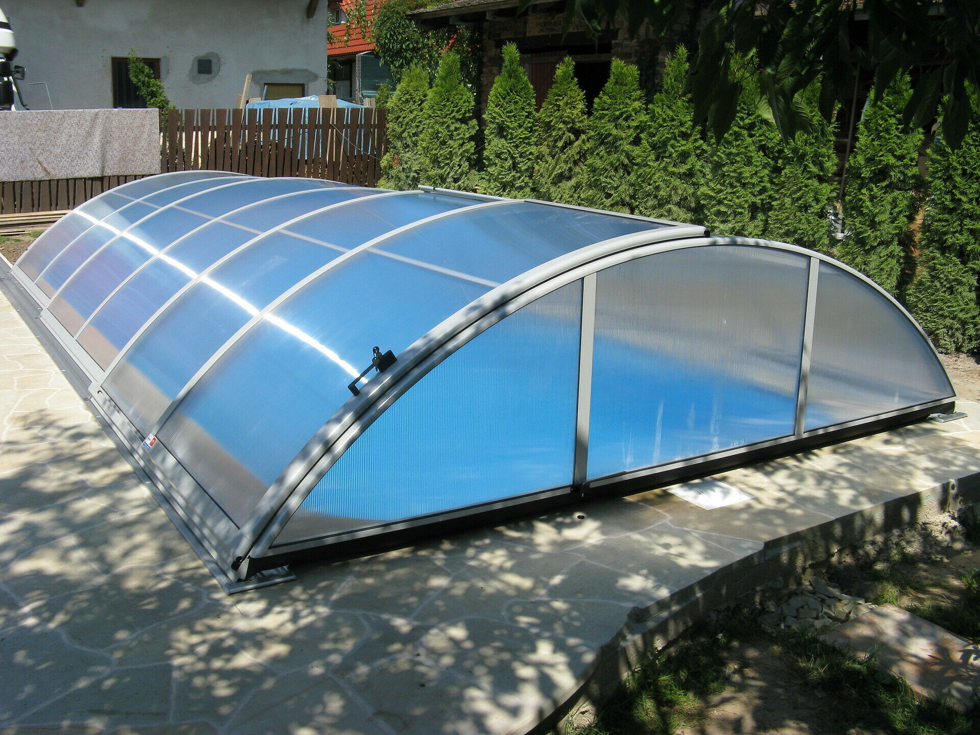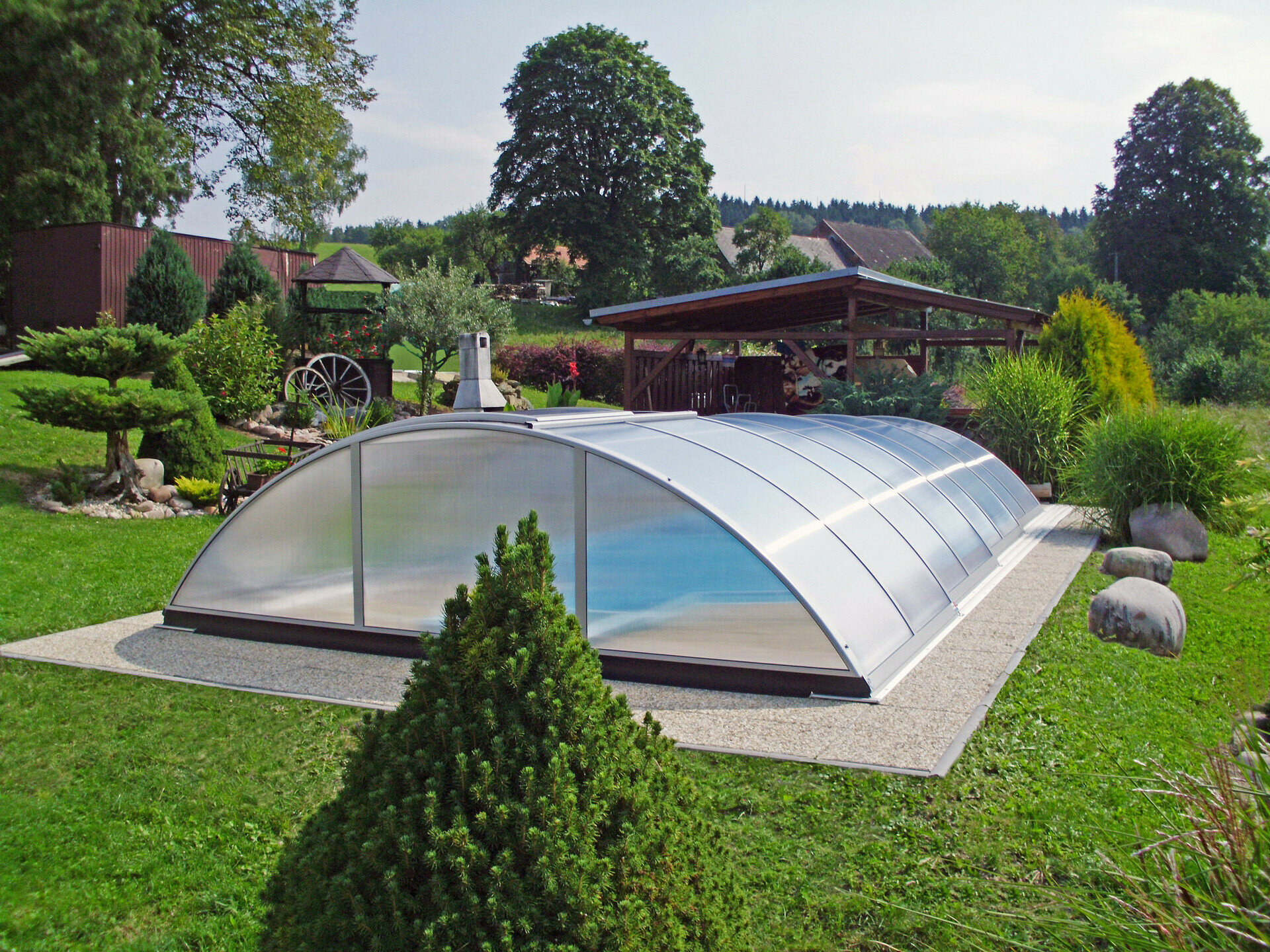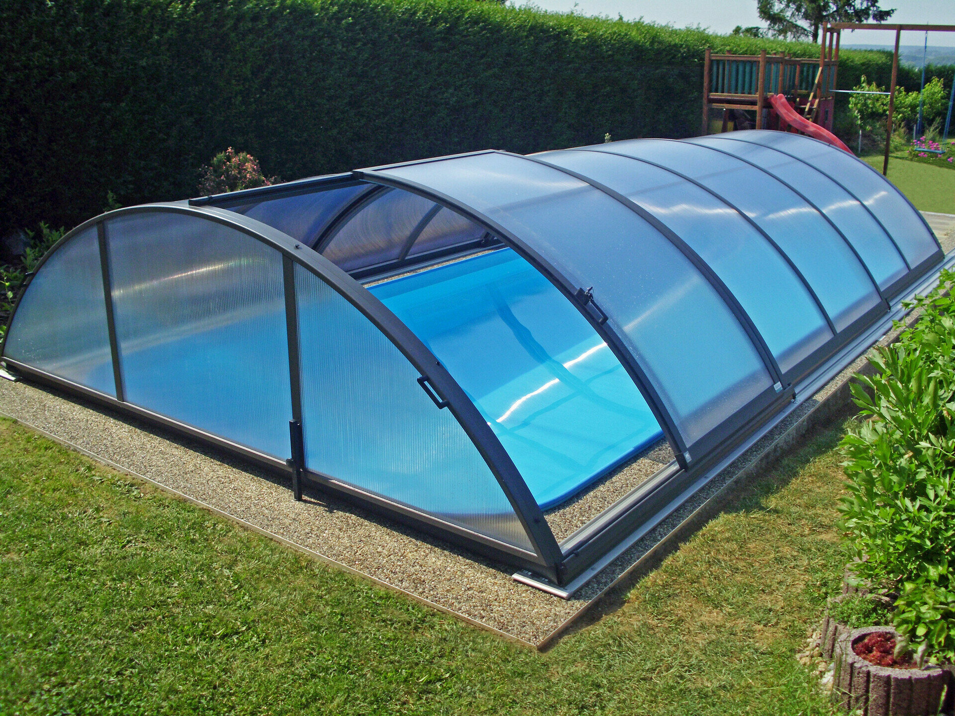 Využíva výhody jedného polomeru hliníkových profilov - zastrešenie tak vyzerá veľmi elegantne. Možnosť voľby výplne - jednokomôrkový alebo kompaktný polykarbonát (pod názvom AZURE kompakt). Výber z dvoch farieb prevedenia hliníkových profilov - strieborná alebo antracitová.